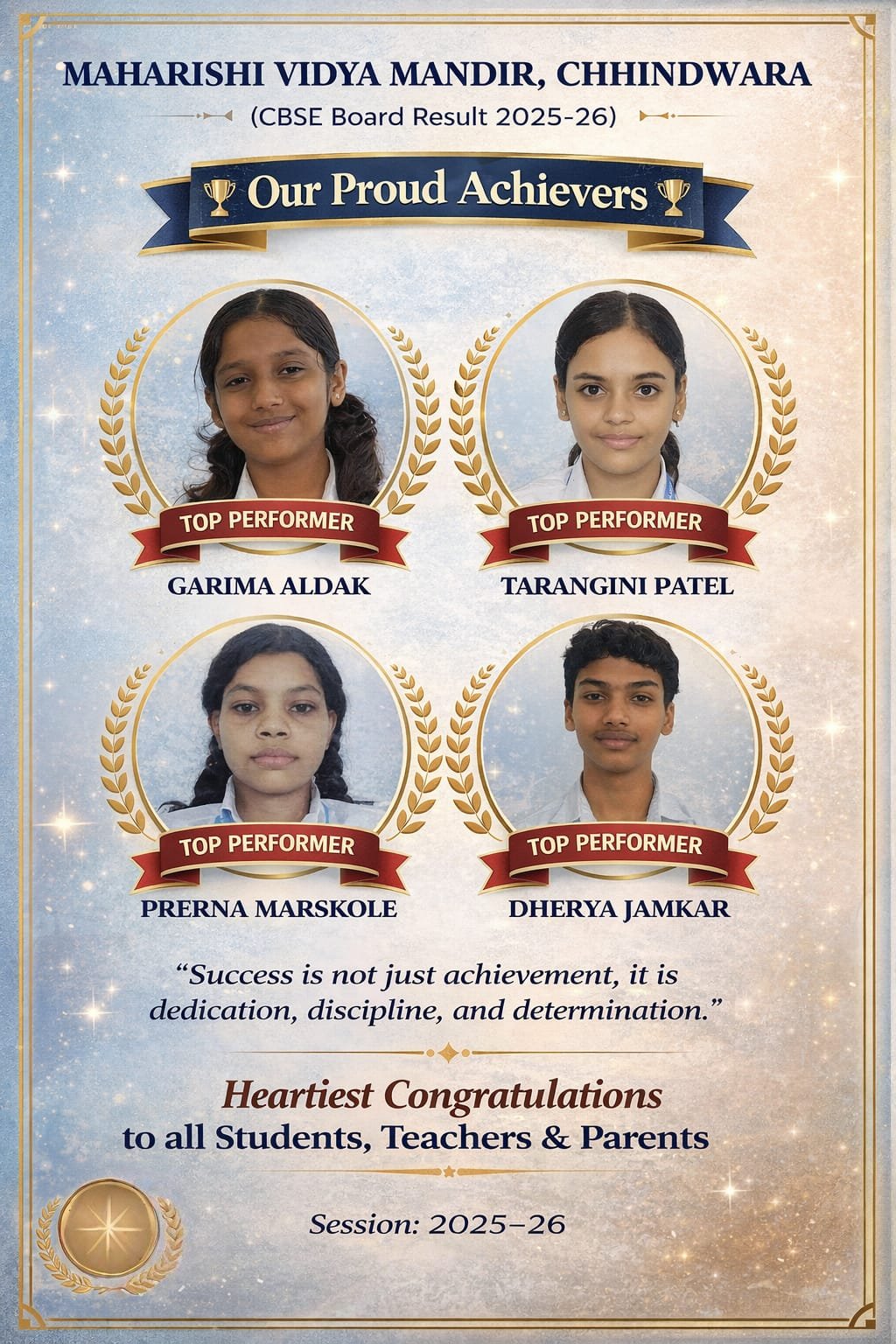 कक्षा 10वीं के आंतरिक मूल्यांकन में विद्यार्थियों ने किया उत्कृष्ट प्रदर्शन; गरिमा अल्दक बनीं टॉपर रेवांचल टाइम्स छिंदवाड़ाजितेन्द्र अलबेला स्थानीय महर्षि विद्या मंदिर में शैक्षणिक सत्र 2025–26 के अंतर्गत कक्षा 10वीं के विद्यार्थियों ने अपनी शैक्षणिक प्रतिभा और कड़े परिश्रम के दम पर विद्यालय का नाम रोशन किया है। हाल ही में घोषित आंतरिक मूल्यांकन परिणामों में विद्यार्थियों ने शानदार…