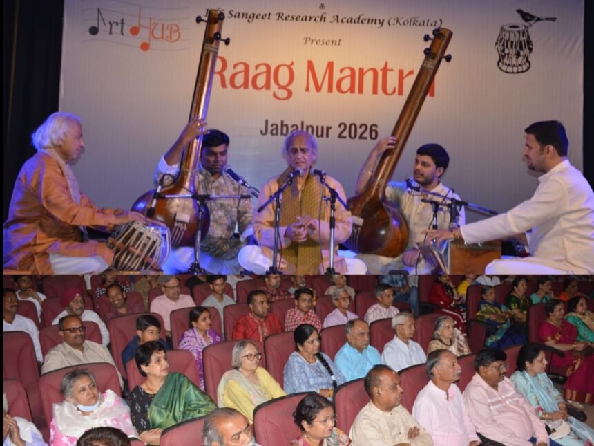 जबलपुर। आर्ट हब, हैदराबाद एवं आई.टी.सी. कोलकाता के संयुक्त तत्वावधान में स्थानीय शहीद स्मारक सभा गृह में “राग मंत्र” शास्त्रीय संगीत सभा का भव्य आयोजन किया गया। इस गरिमामय संगीत संध्या में पुणे से पधारे सुप्रसिद्ध शास्त्रीय गायक पद्मश्री पंडित उल्हास कशालकर के गायन तथा आई.टी.सी. कोलकाता से पधारे श्री शौनक रॉय के सरोद वादन ने श्रोताओं को मंत्रमुग्ध कर दिया।