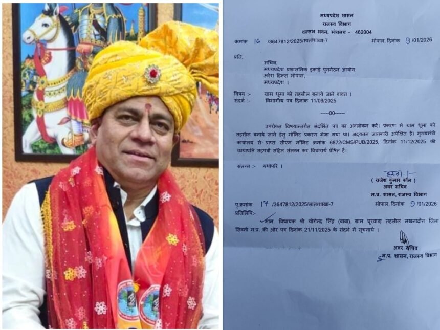 दैनिक रेवाँचल टाईम्स – सिवनी, क्षेत्रीय विधायक योगेंद्रसिंह(बाबा) ने धूमा को तहसील बनाने मुख्यमंत्री को लिखा पत्र मुख्यमंत्री कार्यालय ने कार्यवाही करते हुये सचिव मध्यप्रदेश प्रशासनिक इकाई पुनर्गठन आयोग अरेरा हिल्स भोपाल को