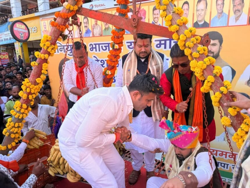 ​11 जेसीबी से हुई पुष्पवर्षा, फल से हुआ तुलादान