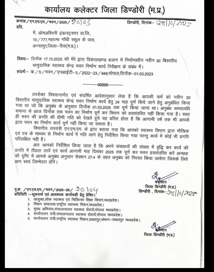 गौरतलब है अक्टूबर माह में डिंडोरी कलेक्टर अंजू पवन भदोरिया ने बजाग मुख्यालय में निर्माणाधीन 30 बिस्तरीय स्वास्थ्य भवन का निरीक्षण किया था। निरीक्षण के दौरान निर्माण कार्य की धीमी गति पर नाराजगी जताते हुए 28 अक्टूबर को नोटिस जारी कर ठेकेदार को दिसंबर 2025 तक भवन पूर्ण कर हस्तांतरित करने के निर्देश दिए गए थे।
