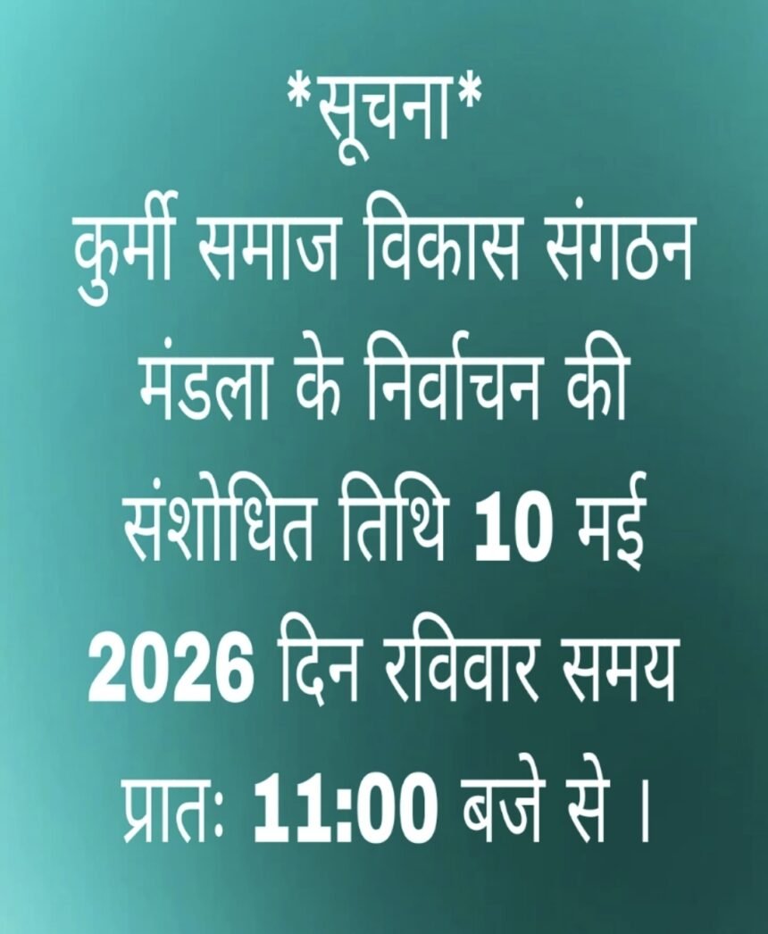 दैनिक रेवाँचल टाईम्स – मंडला, जिले के कुर्मी समाज विकास संगठन मंडला का त्रैवार्षिक निर्वाचन 12 अप्रैल के स्थान पर अब 10 मई 2026 को समय 11 बजे से सम्पन्न कराया जाएगा।